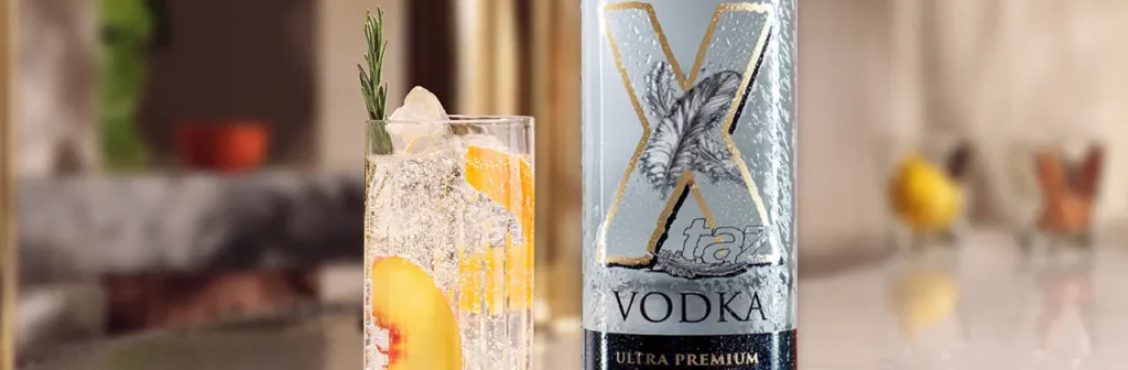 - Fill a chilled glass with cubed ice and add Xtaz® Vodka and slices of White Peach & Rosemary.